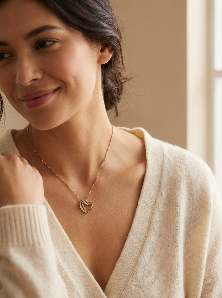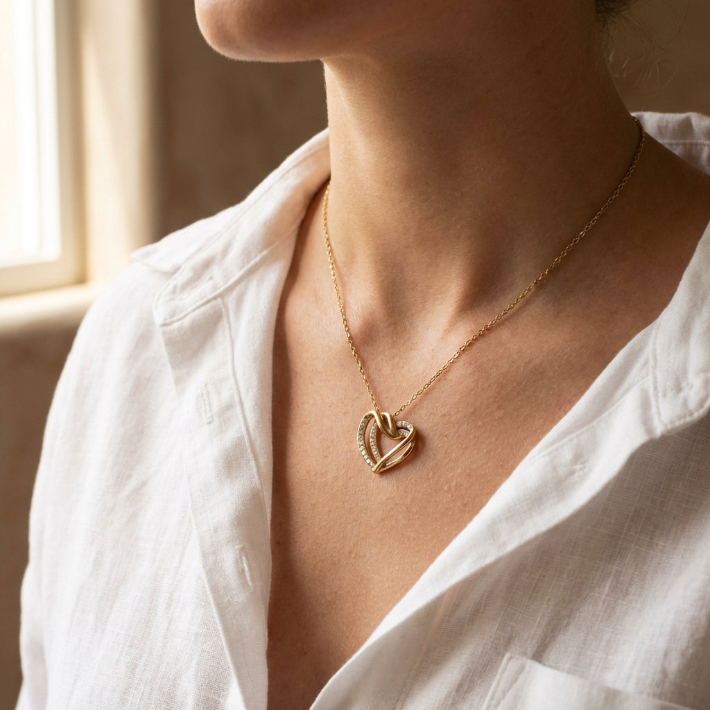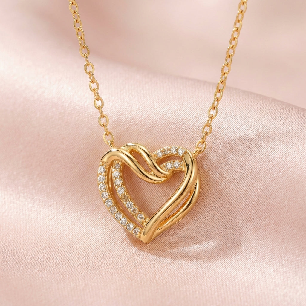 La collana presenta una forma a cuore senza tempo, che simboleggia la connessione tra due anime.