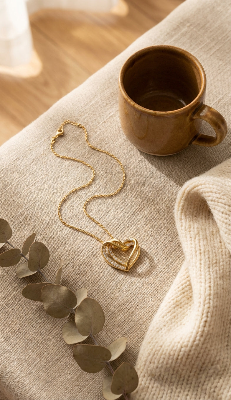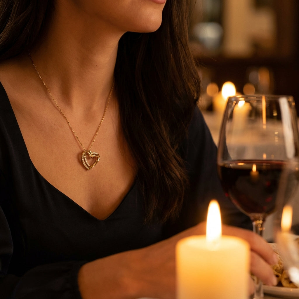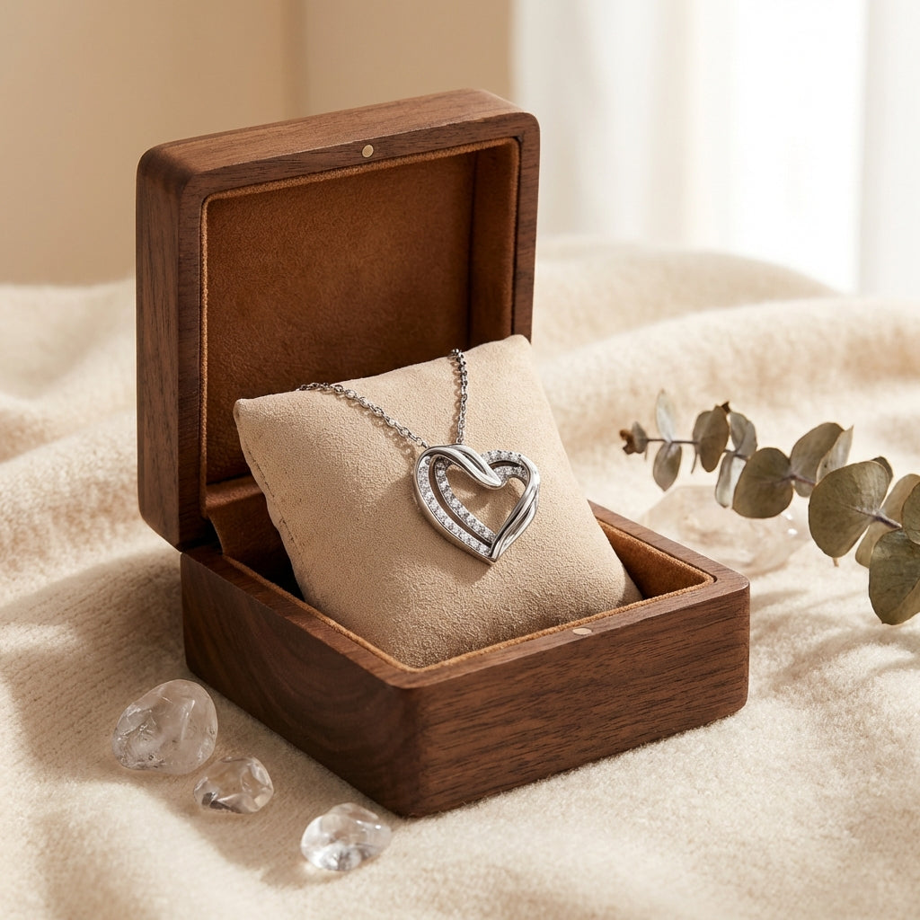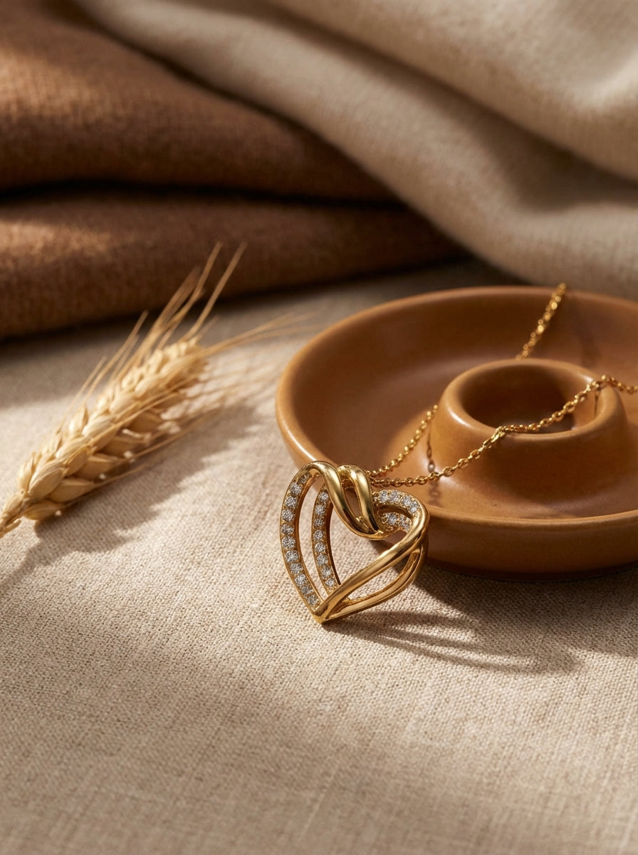 La collana presenta una forma a cuore senza tempo, che simboleggia la connessione tra due anime.
