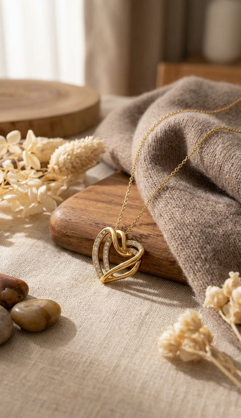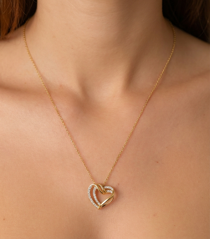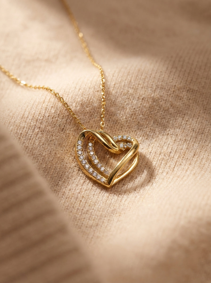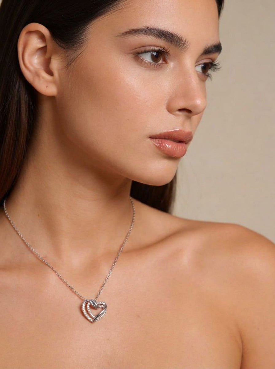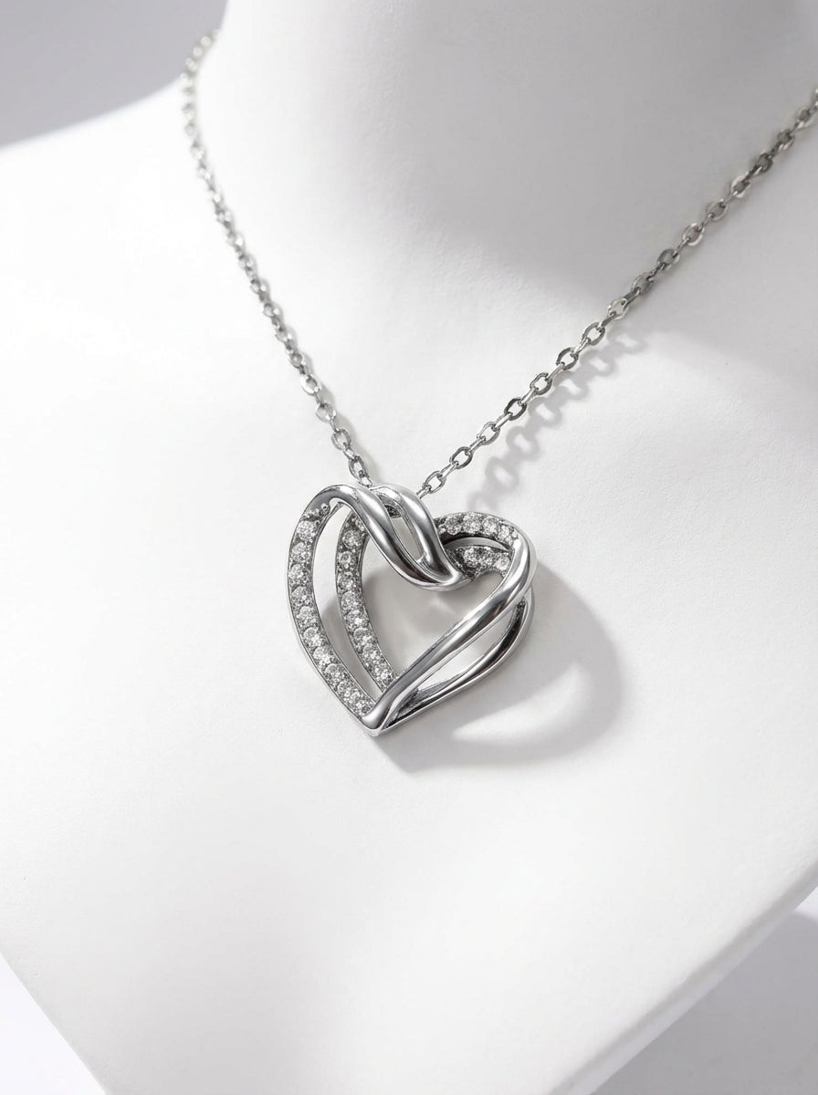 Il pendente a cuore intrecciato, impreziosito da luminosi cristalli, rappresenta l’unione perfetta tra design moderno e romanticismo classico.